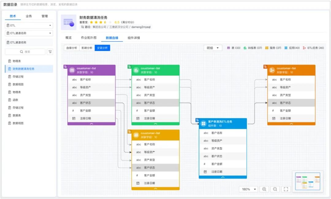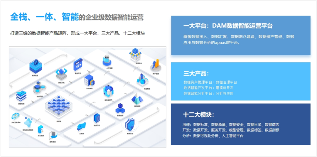 2023年10月26日,2023三維天地數(shù)據(jù)資產(chǎn)高峰論壇在北京成功舉辦。期間全新一代的數(shù)據(jù)資產(chǎn)管理平臺(DAM)v13正式與廣大用戶見面。 全新版DAM V13是基于客戶需求變化而進行的一次功能迭代。平臺吸收了100+項目實施過程中用戶提出的重要需求,進行統(tǒng)一歸納分析提煉,作為階段性需求進行新功能開發(fā),新版本將更貼合項目實際使用場景,在工具化,自動化、智能化的方向走出堅實的一步,以更好地表達三維天地的產(chǎn)品對于企業(yè)數(shù)字化轉(zhuǎn)型的支撐價值。 產(chǎn)品新增了數(shù)據(jù)指標、數(shù)據(jù)建模、數(shù)據(jù)標簽、人工智能四大模塊,強化數(shù)據(jù)治理、提升用戶洞察力,加速數(shù)據(jù)價值快速轉(zhuǎn)化的工具支撐;持續(xù)以主動元數(shù)據(jù)為核心,結(jié)合機器學習、深度學習、自然語言處理技術(shù),對多模塊功能細節(jié)進行匠心打磨,完善功能閉環(huán),功能點迭代數(shù)量80+,充分提升了智能化水平與數(shù)據(jù)管理效率。 在上一版本的基礎(chǔ)上,DAM V13平臺底座更夯實、數(shù)據(jù)治理更高效、數(shù)據(jù)開發(fā)更便捷、數(shù)據(jù)運營更智能,且擁有更標準及更為閉環(huán)的數(shù)據(jù)治理與智能數(shù)據(jù)分析解決方案。平臺具備搜索問答式數(shù)據(jù)分析系統(tǒng),問答式交互,搜索式體驗,將變革數(shù)據(jù)分析流程全場景的數(shù)據(jù)整合,讓數(shù)據(jù)“慧”說話;全鏈路協(xié)同的數(shù)據(jù)開發(fā)讓工具回歸為人服務的本質(zhì),全方位地提升一線數(shù)據(jù)開發(fā)人員/業(yè)務人員的工作效率。 DAM數(shù)據(jù)資產(chǎn)管理平臺是全棧、一體、智能的企業(yè)級數(shù)據(jù)智能運營平臺,形成了一大平臺、三大產(chǎn)品、十二大模塊的完整產(chǎn)品矩陣。主要包括治理、開發(fā)、分析三大產(chǎn)品,涵蓋數(shù)據(jù)目錄、數(shù)據(jù)標準、數(shù)據(jù)質(zhì)量、數(shù)據(jù)安全、數(shù)據(jù)開發(fā)、主數(shù)據(jù)建模、數(shù)據(jù)建模、指標建模、標簽建模、AI人工智能、BI商業(yè)智能、數(shù)據(jù)超市能等12大模塊,支持從數(shù)據(jù)治理到數(shù)據(jù)開發(fā)到數(shù)據(jù)分析的全鏈路的數(shù)據(jù)資產(chǎn)管理能力。 特性一:增強式數(shù)據(jù)目錄 傳統(tǒng)的數(shù)據(jù)資產(chǎn)目錄主要集中在結(jié)構(gòu)化數(shù)據(jù)庫表管理。而三維天地的數(shù)據(jù)目錄在此基礎(chǔ)上擴展了BI看板、ETL作業(yè)、主數(shù)據(jù)模型等類型,可以展示更多樣的數(shù)據(jù)對象,更細節(jié)的血緣關(guān)系,更及時的數(shù)據(jù)特征。 特性二:數(shù)據(jù)質(zhì)量的閉環(huán) 在以往項目實踐中,客戶不愁發(fā)現(xiàn)問題,而是更注重如何將發(fā)現(xiàn)的問題得以解決、將有問題的數(shù)據(jù)整改到位。因此平臺支持數(shù)據(jù)質(zhì)量的事前、事中、事后的閉環(huán)管理,即事前需求和規(guī)則定義、事中質(zhì)量監(jiān)控以及事后量化分析和問題追溯。 特性三:治理到自助式敏捷應用的閉環(huán) 平臺具備從數(shù)據(jù)治理到自助式敏捷應用的閉環(huán)一體化管理。在資產(chǎn)平臺中,數(shù)據(jù)治理結(jié)束后,平臺具備商業(yè)智能、人工智能、指標管理、標簽畫像以及智能應用等各模塊,以滿足用戶的個性化應用的構(gòu)建。當已有的應用無法滿足訴求時,業(yè)務人員也可通過數(shù)據(jù)超市自助獲取數(shù)據(jù)、自助分析數(shù)據(jù)。實現(xiàn)治理到分析的全流程閉環(huán)應用。 特性四:基于知識圖譜的增強數(shù)據(jù)治理 平臺結(jié)合AI、知識圖譜,有效提高了數(shù)據(jù)治理的效率,如業(yè)務域自動分類、數(shù)據(jù)標準自動生成、數(shù)據(jù)資產(chǎn)推薦、智能血緣推薦等,智能化的功能貫穿數(shù)據(jù)資產(chǎn)平臺的方方面面。 特性五:數(shù)據(jù)資產(chǎn)合理評估及入表 在數(shù)據(jù)資產(chǎn)入表的大背景下,產(chǎn)品適時推出自研的數(shù)據(jù)資產(chǎn)評估模型,通過對數(shù)據(jù)資產(chǎn)的成本因素、場景因素、市場因素和質(zhì)量因素等方面進行多維分析評估,為數(shù)據(jù)資產(chǎn)合理定價及市場流通奠定基礎(chǔ)。 特性六:數(shù)據(jù)開發(fā)和治理一體化 企業(yè)在以往數(shù)據(jù)中臺的建設(shè)效果不顯著。全新平臺將數(shù)據(jù)治理的流程與數(shù)據(jù)開發(fā)的全生命周期深度融合,通過數(shù)據(jù)開發(fā)一體化,在數(shù)據(jù)標準驅(qū)動模型構(gòu)建基礎(chǔ)上,有序高質(zhì)量地進行數(shù)據(jù)生產(chǎn),在數(shù)據(jù)開發(fā)過程中,完成數(shù)據(jù)治理。實現(xiàn)“標準即設(shè)計,設(shè)計即開發(fā),開發(fā)即治理”的開發(fā)治理一體化理念。 特性七:高效、輕量化的指標建模 過去指標的建設(shè),依賴開發(fā)人員手工編寫sql,業(yè)務人員用BI畫報表,不同人員對于業(yè)務指標存在不同的理解,產(chǎn)生的結(jié)果各異,既不便于統(tǒng)一管理,更難于進行問題溯源。 特性八:指標管理+BI實現(xiàn)指標中臺體系化 指標結(jié)合BI平臺,實現(xiàn)基于指標的可視化展現(xiàn);兩者相輔相成,指標賦能BI,基于數(shù)據(jù)表可以直接構(gòu)建圖表展現(xiàn)