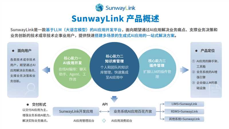 SunwayLink是一款基于LLM(大語言模型)的AI應(yīng)用開發(fā)平臺,面向期望通過AI應(yīng)用解決業(yè)務(wù)痛點、支撐業(yè)務(wù)決策和業(yè)務(wù)創(chuàng)新的技術(shù)或非技術(shù)企事業(yè)用戶,提供快速搭建多場景的生成式AI應(yīng)用的一站式解決方案??梢蕴峁┝奶熘?、智能體、工作流三種應(yīng)用開發(fā)能力,開發(fā)好的應(yīng)用可快速封裝為API,可由后端或前端應(yīng)用直接調(diào)用,提供基于RAG(檢索增強生成)技術(shù)的可視化知識庫構(gòu)建能力,快速接入結(jié)構(gòu)化和非機構(gòu)化數(shù)據(jù)構(gòu)建個人和企業(yè)知識庫。