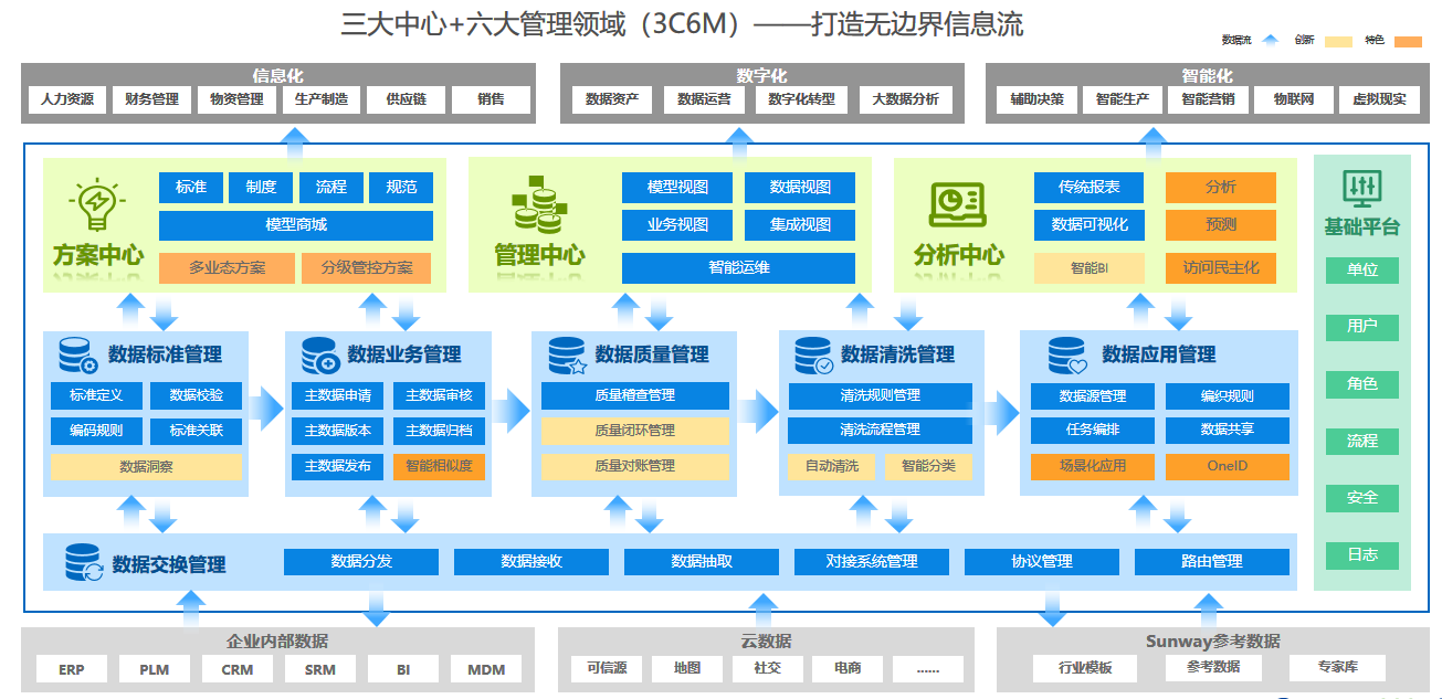 北京三維基于在主數(shù)據(jù)管理領(lǐng)域深耕細(xì)作,整合為眾多特大型央企和集團(tuán)型企業(yè)的項(xiàng)目建設(shè)經(jīng)驗(yàn),融合了數(shù)據(jù)標(biāo)準(zhǔn)管理、數(shù)據(jù)生命周期管理、數(shù)據(jù)交換管理、數(shù)據(jù)質(zhì)量管理、數(shù)據(jù)清洗管理、數(shù)據(jù)應(yīng)用管理六大模塊,方案中心、分析中心、管理中心三大中心以及Mobile移動(dòng)辦公,打造3C6M—體化主數(shù)據(jù)管理解決方案,為客戶提供從標(biāo)準(zhǔn)建立、數(shù)據(jù)質(zhì)量管控、數(shù)據(jù)交換應(yīng)用、數(shù)據(jù)治理,到企業(yè)數(shù)據(jù)方案中心建設(shè)、數(shù)據(jù)場景化的深入應(yīng)用、智能化數(shù)據(jù)管理、智能化運(yùn)維等全面的管控、洞察、應(yīng)用一體化解決方案,為企業(yè)數(shù)據(jù)標(biāo)準(zhǔn)化建設(shè)、數(shù)據(jù)治理提供強(qiáng)大支持,助力企業(yè)實(shí)現(xiàn)無邊界信息流。